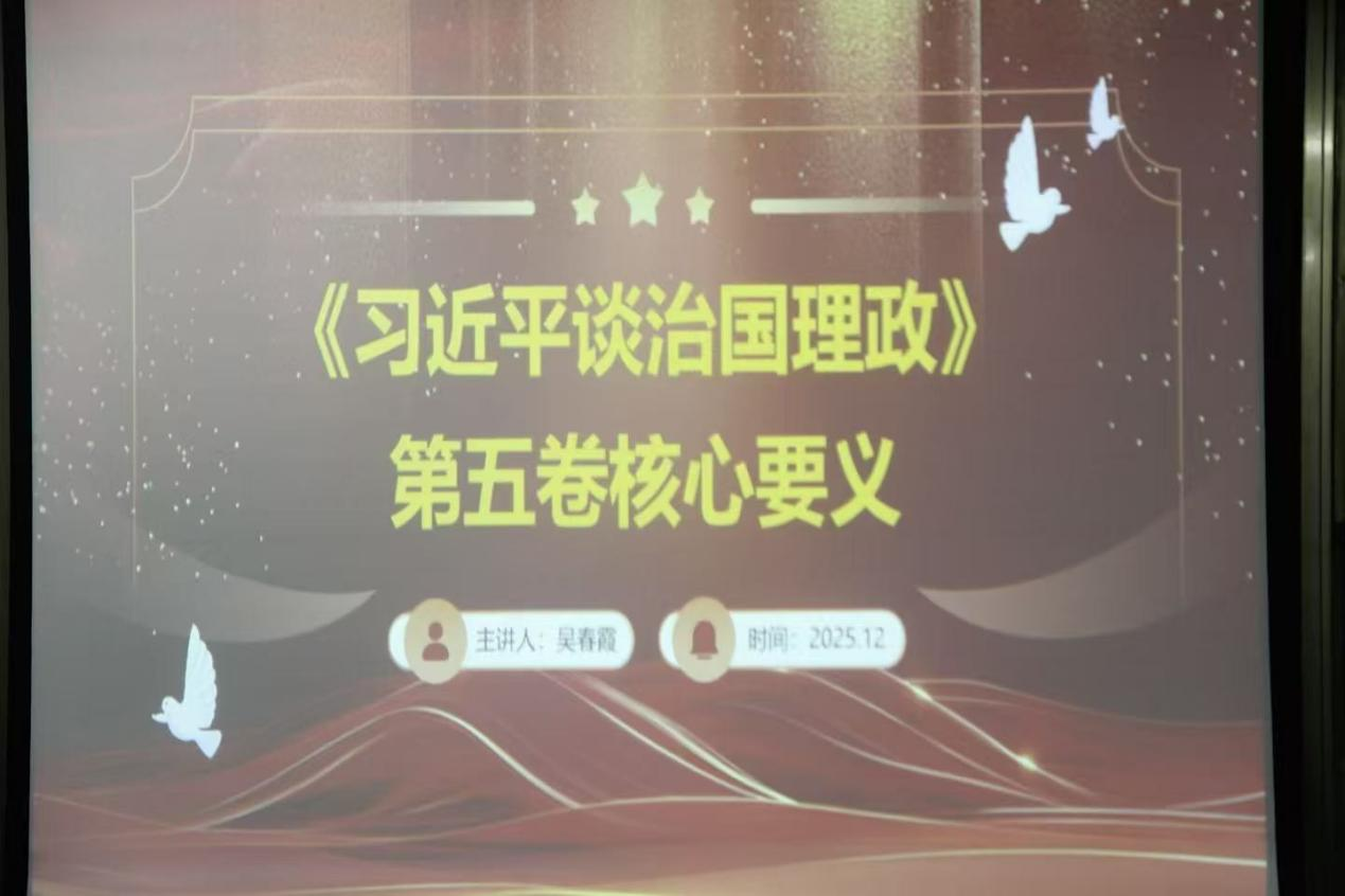 本次课程以《习近平谈治国理政》第五卷为核心内容,深入解读这部权威著作的理论内涵与实践价值。该书清晰展现了党的二十大以来习近平新时代中国特色社会主义思想在理论与实践上的双重突破,既是学习党的创新理论的重要教材,也为各项工作开展提供了有力指引。分享中,吴春霞老师围绕书中五大核心要义展开交流,明确中国式现代化是新时代党和国家工作的总纲,要以党的领导为根本,依靠人民推进强国建设与民族复兴;全面深化改革是发展的关键一招,既要总结过往改革成效,也要锚定2035年目标稳步推进;她还提到“两个结合”作为理论创新的最大法宝,推动形成了一系列重要思想成果,为发展开辟了新境界;党的领导、制度优势与人民拥护的有机统一,是凝聚发展合力的坚实基础;而理论的体系化与学理化建设,则让党的创新理论更具说服力和引领力。成员们纷纷表示,学习这本书要切实把理论所学转化为政治站位、工作能力和奋斗动力,增强“四个意识”、坚定“四个自信”、做到“两个维护”,以党的创新理论为指引攻坚克难,为推动中国式现代化建设、实现中华民族伟大复兴的中国梦贡献力量。